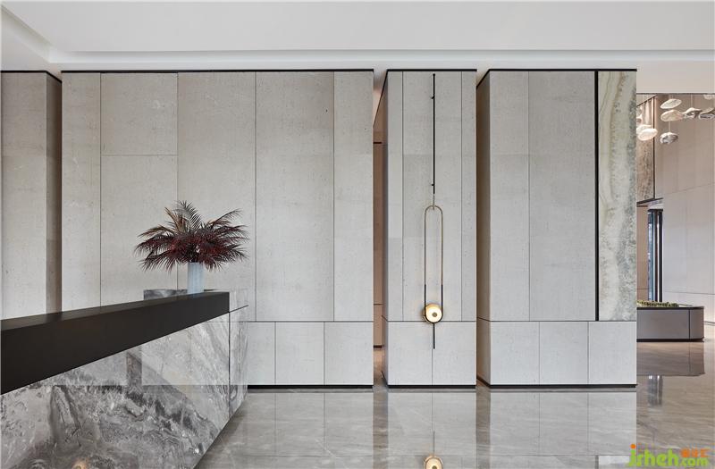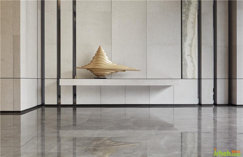 我們以抽縫的方式,將石材做出格柵的感覺,既順應(yīng)中軸線設(shè)計,又形成獨(dú)特的空間矩陣,寧波售樓處設(shè)計形成空間在閱讀視覺上的屏障。人在空間中移動,風(fēng)景在縫隙間躲躲藏藏,如同蘇州園林中的步移景異。