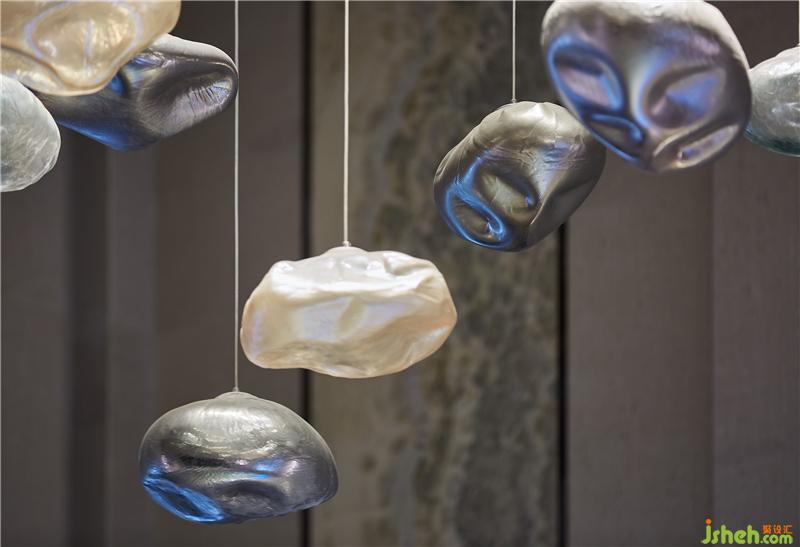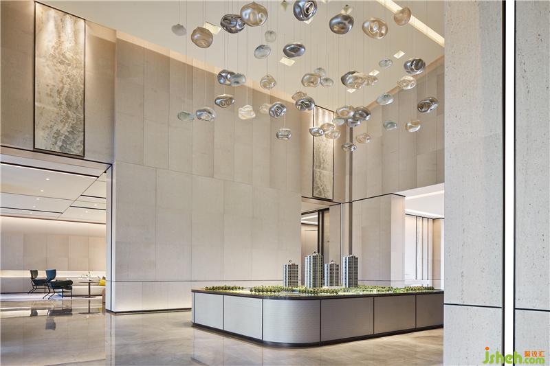 我們希望把一些中式感覺帶進(jìn)空間。在沙盤區(qū)上空懸掛玻璃吹制的吊飾,像漂浮在空中的石頭;沙盤區(qū)的空間頂面以中式屋頂元素勾勒,所有立面以及石材的切割比例,都在延伸中式卷軸畫作的意象。