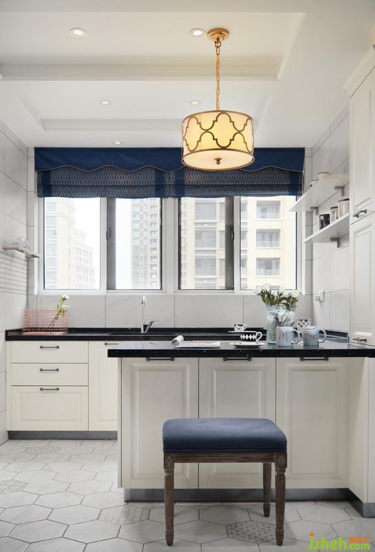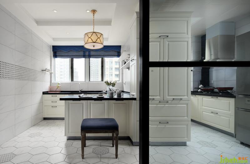 廚房地面貼了六角啞光磚加上花磚的點綴,卡拉拉白的瓷磚與米色的櫥柜很好的融合在一起。