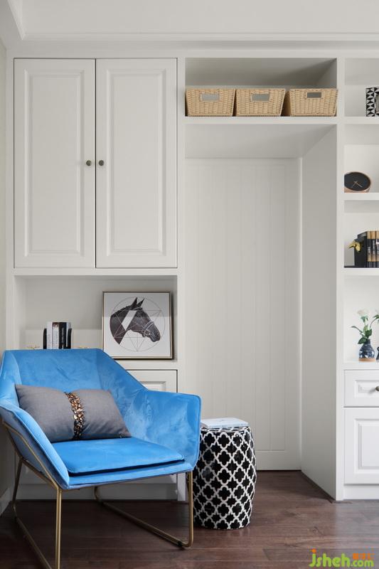 藍色寫字桌和整體空間非常匹配,與藍色羅馬簾、沙發(fā)相呼應(yīng)。