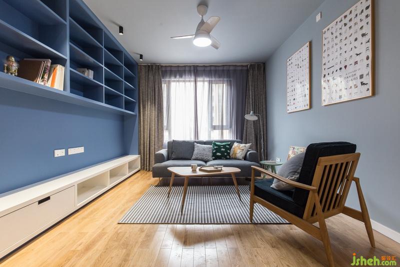 客廳的藍(lán)色裝飾柜和灰色墻面彼此對立著,顯得格外突兀。藍(lán)色令人想到孤獨、沉思、獨立和平靜;灰色穿插于黑白兩色之間,更有些暗抑的美。藍(lán)色與灰調(diào)的碰撞,居中小巧的風(fēng)扇燈,更凸顯了一切井然有序。