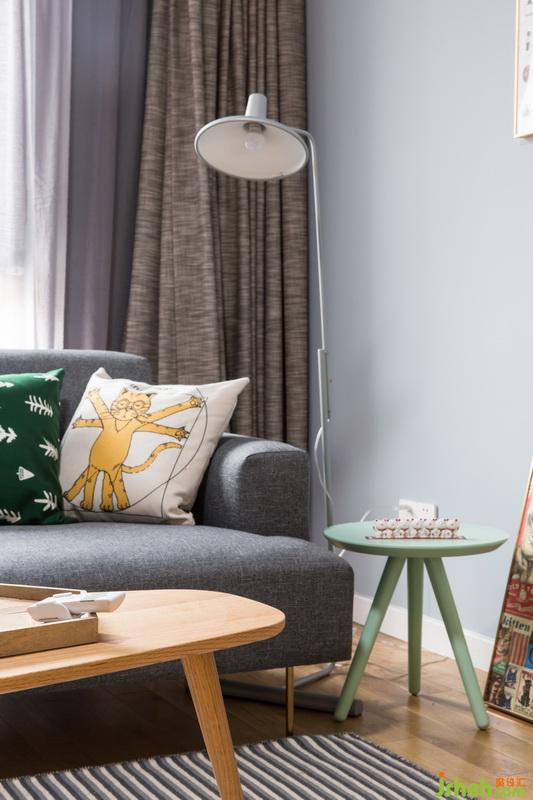 灰色的落地?zé)?,恰巧融入布局中。綠色的小茶幾,帶來了一份新意。