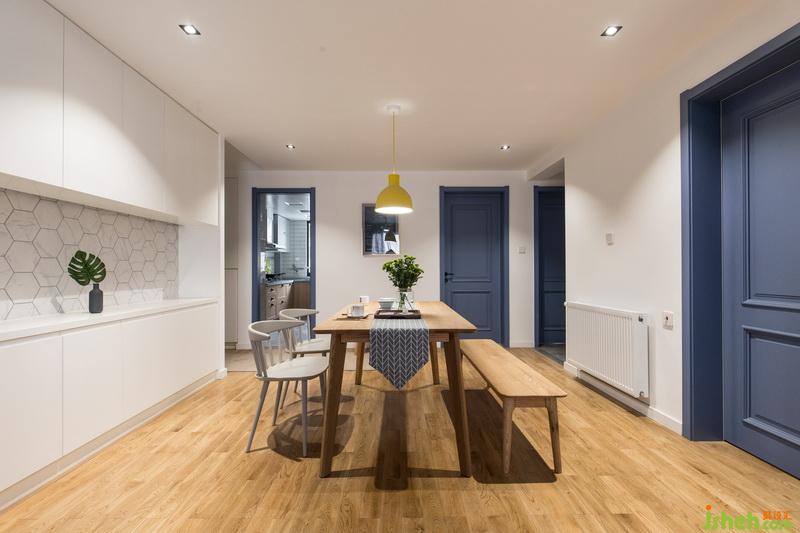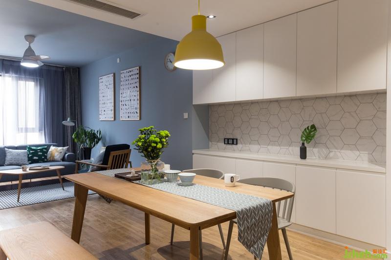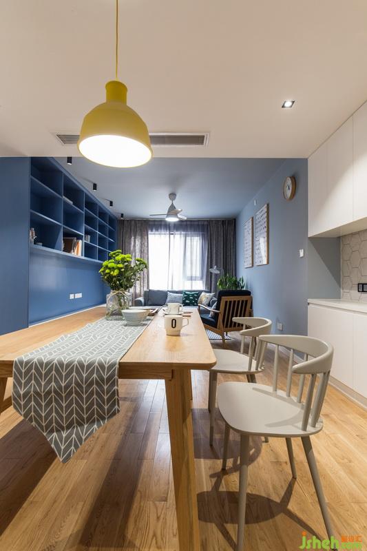 整個客餐廳空間并不是太大,藍(lán)色、灰色、白色與木色之間的呼應(yīng),使得整體更具立體與層次感。