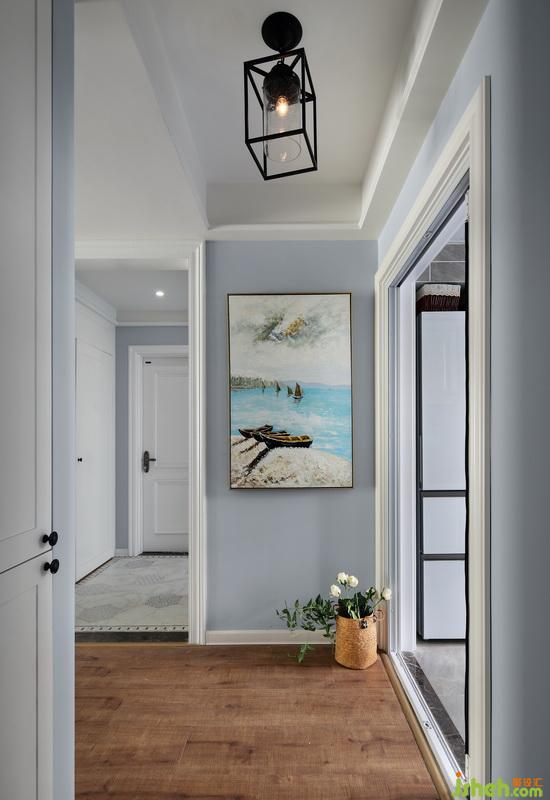 走廊僅能窺探到客廳的一隅,最先令人注意到的大概是那明亮的窗幔吧,與整個(gè)客廳的清冷色調(diào)不同的是,窗幔室內(nèi)設(shè)計(jì)師大膽的選擇了明黃色,卻也有說不出的和諧。細(xì)細(xì)的走廊,畫下看似隨意的花枝,無一不吐露著寧?kù)o的芬芳。如此雅致的掛畫更讓人期待內(nèi)室的風(fēng)景。室內(nèi)設(shè)計(jì)師