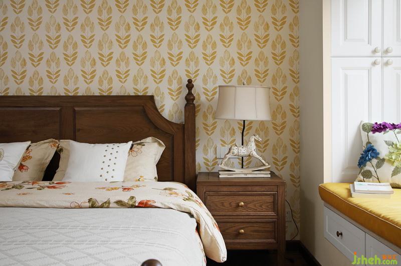 臥室同樣延續(xù)著整體風格色調,黃色麥穗花樣的墻紙,原木材質的床,花香鳥語的床品讓整個空間更加飽滿。