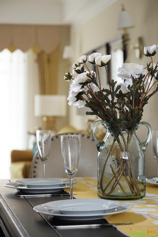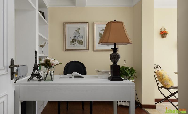 書房墻面打造了兼具陳列和收納功能的柜體,墻面掛上兩幅植物裝飾畫,精致的臺燈和精美的桌上擺件,無不宣告著主人的優(yōu)雅內涵。