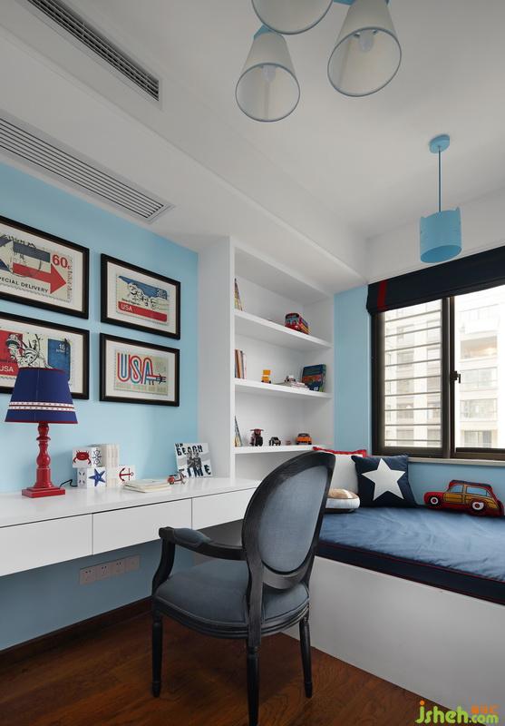 藍色清爽的房間布置為這個小小主人營造了整潔又科學合理布置的學習生活氛圍。