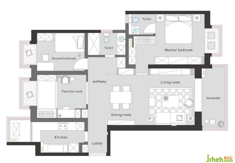 這是一套南北通透性好,比較規(guī)整的戶型。室內(nèi)設(shè)計(jì)師將朝北的一間房設(shè)計(jì)為書房、榻榻米和收納兼具的多功能活動(dòng)空間,釋放了家里空間的合理利用率。在主衛(wèi)的位置,縮小了它的空間,省去了洗浴功能,增加了主臥的收納空間,次衛(wèi)的洗浴功能完全可以滿足三口之家的需求。陽(yáng)臺(tái)沒有像傳統(tǒng)家居那樣放置洗衣機(jī)、烘干機(jī)和水池,而是作為客廳的延伸,成為單純的休閑區(qū),恰恰反映出這是一個(gè)會(huì)享受、愛生活的小小家。