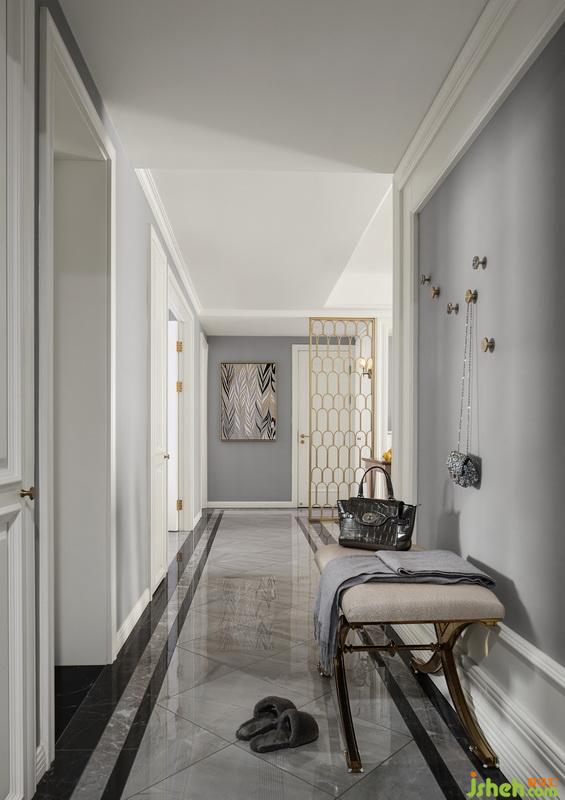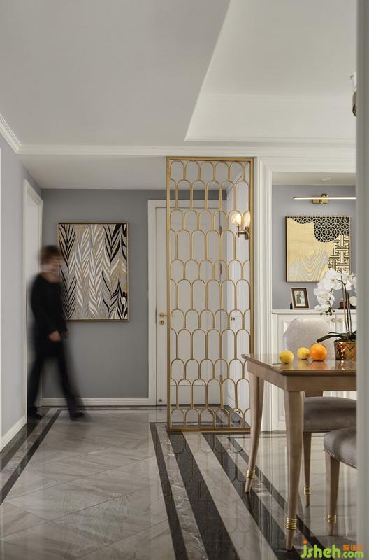 過道的盡頭掛了抽象油畫,我們回到家之后多了一份看點(diǎn),增加了家里的藝術(shù)氣息。金色隔斷的設(shè)置,使得空間格局更加完整,也為家里增添了一處景致。