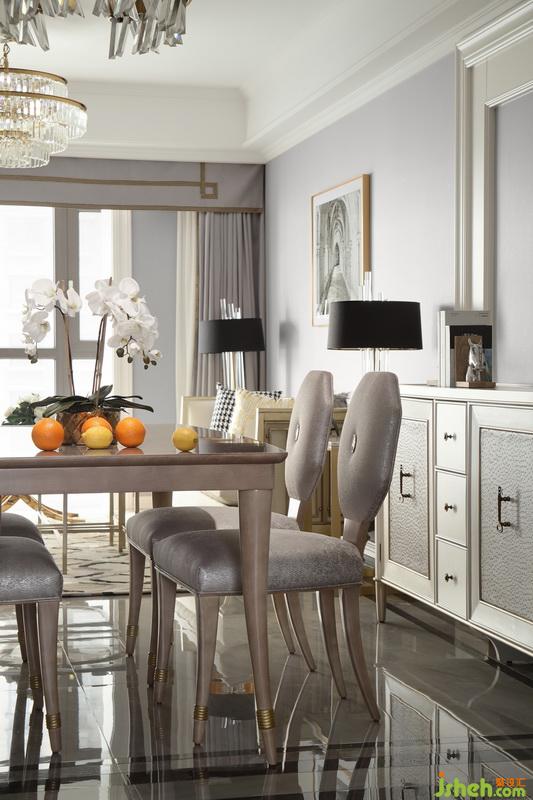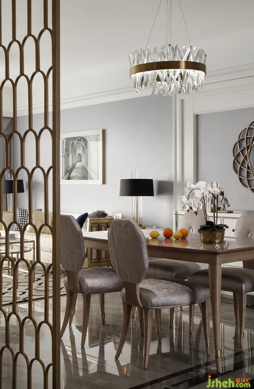 餐廳的金色水晶吊燈由幾根可調(diào)節(jié)高度的吊線承重,晶瑩剔透、明凈高雅。餐桌椅是以木色與象牙白結(jié)合的婉約配色,順滑簡潔的線條和輪廓將活力前衛(wèi)貫穿其中,使得整個餐廳呈現(xiàn)出簡潔明快的視覺效果。
