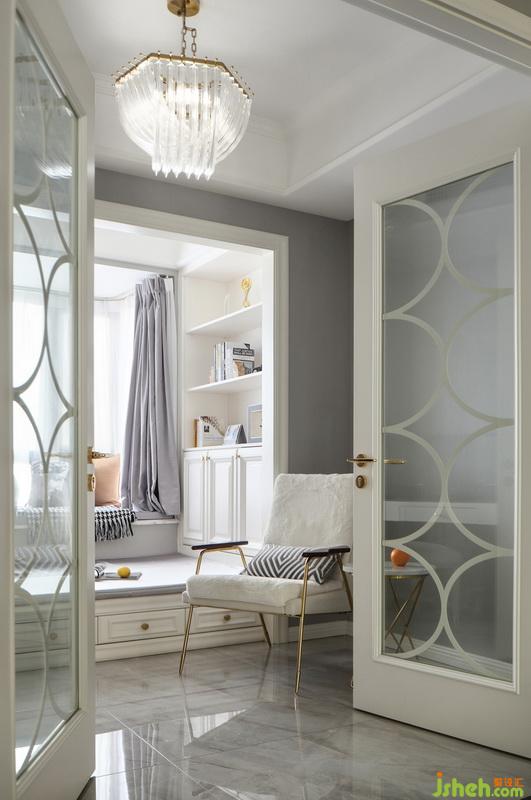 餐廳緊挨的是由書房、榻榻米和收納組成的多功能室,滿足了家庭的多種需求。這里也延續(xù)了客餐廳的金色水晶吊燈,層疊交錯的玻璃弧線,為空間織就一簾夢幻曼妙的感覺。羊毛椅質(zhì)地柔軟,簡潔美觀,靠在上面可以享受全身心放松的家居時光。