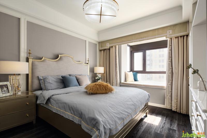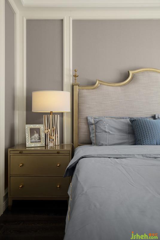 香檳金的床頭柜使整個房間看起來非常的高貴大方,凸顯了屋主不凡品味。復古的相框,顏色淡淡的藍像洗白的沙子透過海水般的美,帶來一份文藝氣息。