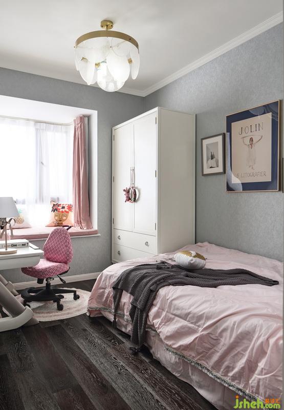 兒童房墻面鋪滿了灰藍色的墻紙,可打造出高雅舒柔的視感基調(diào),整體顯得清新舒適。衣柜上的粉色花環(huán),飄窗上的粉色戴花姑娘,可愛溫馨,滿足了孩子的少女心。