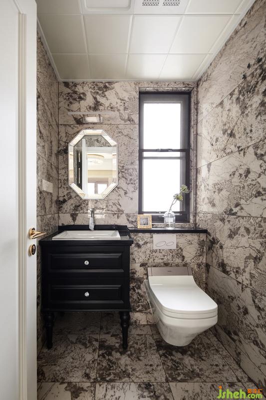 主衛(wèi)只保留了化妝鏡、洗手池和馬桶,清爽簡潔,瓷磚的紋理變化恰好給空間增添了一道靚麗的風景。