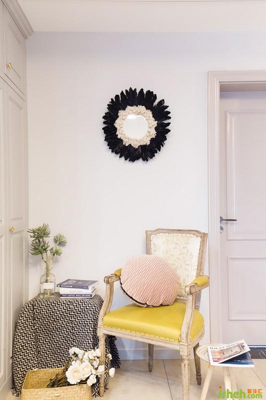 室內(nèi)設(shè)計(jì)師在客餐廳設(shè)計(jì)了一塊休閑區(qū),慵懶的午后靠在此處看看喜愛(ài)的書籍也是很愜意的。墻上的羽毛裝飾鏡不僅起到點(diǎn)綴作用,也給屋子帶來(lái)了一絲暖意。小巧輕便的托盤桌,簡(jiǎn)樸、素雅,可以給午后的咖啡找一個(gè)支撐點(diǎn),很適合小戶型的家庭使用。