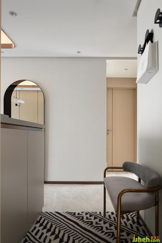 進(jìn)門的玄關(guān)左手邊是定制的鞋柜,室內(nèi)設(shè)計師選用灰色柜體搭配同色系石材臺面,含蓄低調(diào),充滿時尚感。地面灰色花紋地墊搭配金色腿換鞋凳,方便我們出行的同時又散發(fā)出了摩登氣息。右邊墻上室內(nèi)設(shè)計師安裝了3枚簡約多功能的藍(lán)灰色掛鉤,像小豬一樣可愛萌趣,很好的融入墻壁又方便我們隨手掛包及小物。墻上鋪貼了灰色的墻布,使整體家居在色彩上柔和穩(wěn)重、和諧統(tǒng)一。