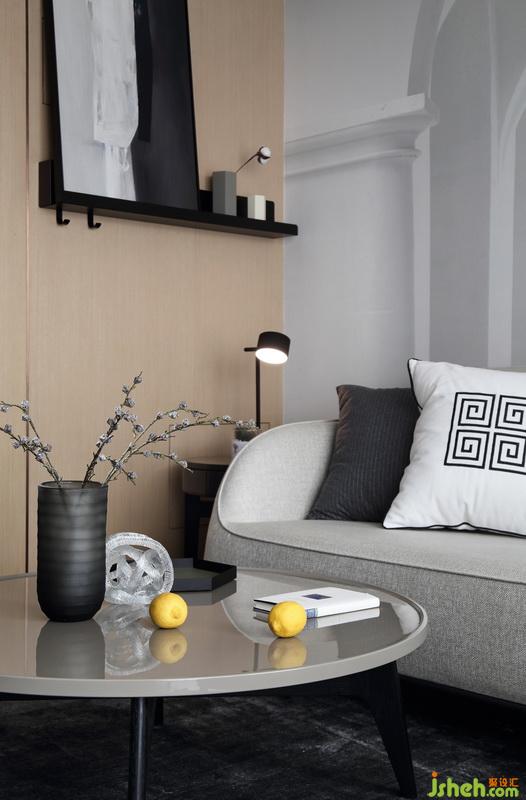 茶幾上橫紋漸變灰的花瓶與不規(guī)則水晶擺件,放在一起顯得很有氣質(zhì),高低落差之間使得空間更有層次感。