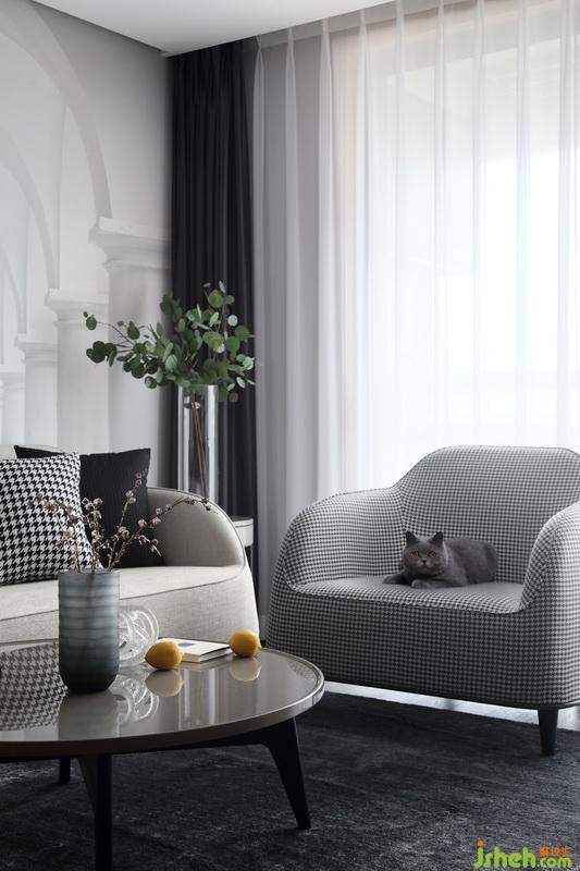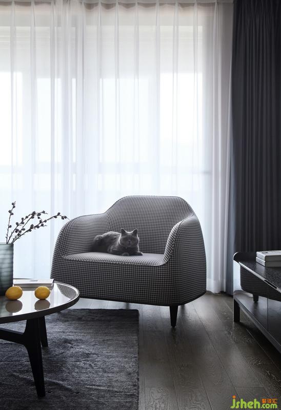 室內(nèi)設(shè)計師在地上鋪設(shè)了深灰的純色地毯,無繁復(fù)圖案,自然簡約、溫和而舒適。選購的茶幾結(jié)構(gòu)簡潔精煉,臺面烤漆,使得整個空間精致感十足。純灰色的貓咪趴在千鳥格的沙發(fā)上,恰巧與整體色調(diào)相匹配,成為了家里不可或缺的一員。