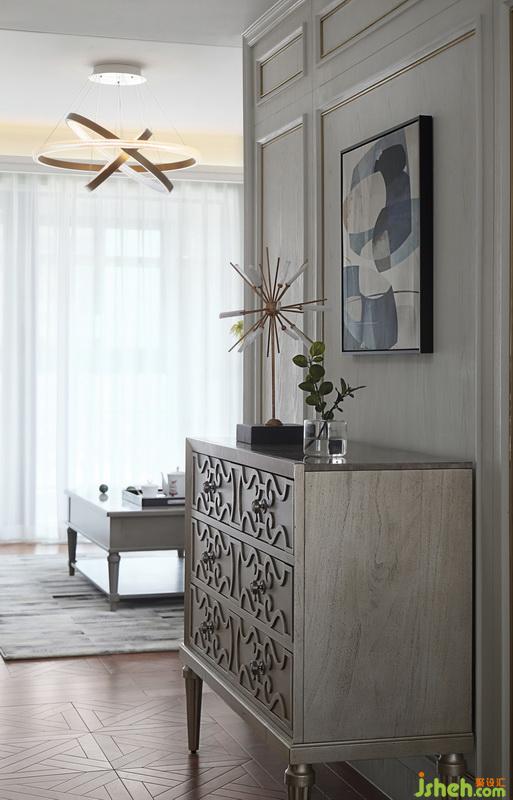 進(jìn)門即是玄關(guān),玄關(guān)柜將鞋柜功能及裝飾融合在一起,柜上精美的圖紋猶如象形文字“羊”,有吉利、祥瑞的寓意,可以展示出屋主的品位。藍(lán)調(diào)的抽象畫(huà)掛在淺灰的護(hù)墻上,帶來(lái)一份簡(jiǎn)潔、優(yōu)雅的美。桌上的石英石擺件簡(jiǎn)單、輕巧,使空間更顯質(zhì)感與靈動(dòng)。搭配幾支花花草草,擺放在此處,讓人倍感生活儀式感。