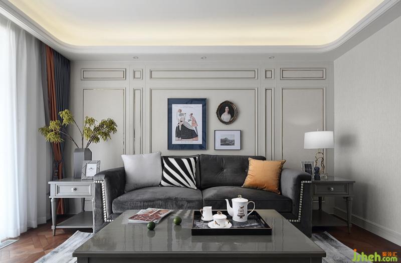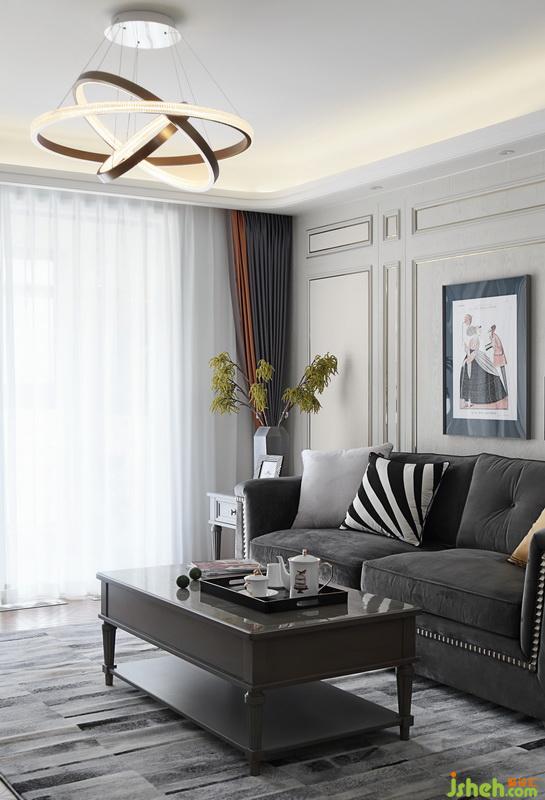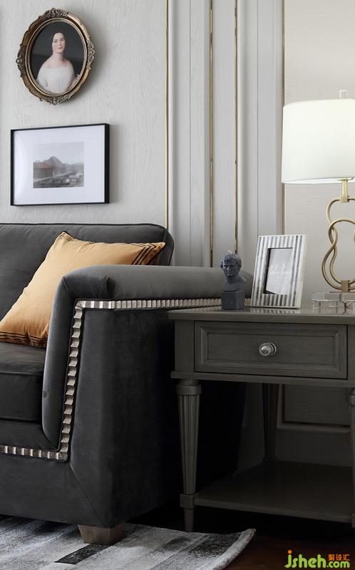 客廳背景墻上的一組裝飾畫(huà)是現(xiàn)代與復(fù)古結(jié)合的碰撞,突顯出室內(nèi)濃厚的韻味。沙發(fā)不經(jīng)多余的修飾,深灰色的搭配穩(wěn)重、考究,中間嵌入的扇貝型木條簡(jiǎn)約時(shí)尚如海面的波紋,提升空間獨(dú)特的格調(diào)和品位。