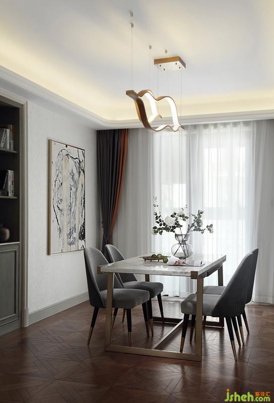餐廳室內(nèi)設(shè)計師使用吊燈,吊燈猶如不規(guī)則的曲線上下波動,簡約而不簡單,充滿藝術(shù)感,輕松塑造出家里的時髦腔調(diào)。大理石與金色結(jié)合的餐桌,顯得既清爽又精致,滿滿的高級感。餐椅的灰黑金搭配,很顯氣質(zhì),可以讓我們在用餐的同時感受到一絲暖意。墻面通過一副抽象畫來點(diǎn)綴其中,可以提升屋主的品位。