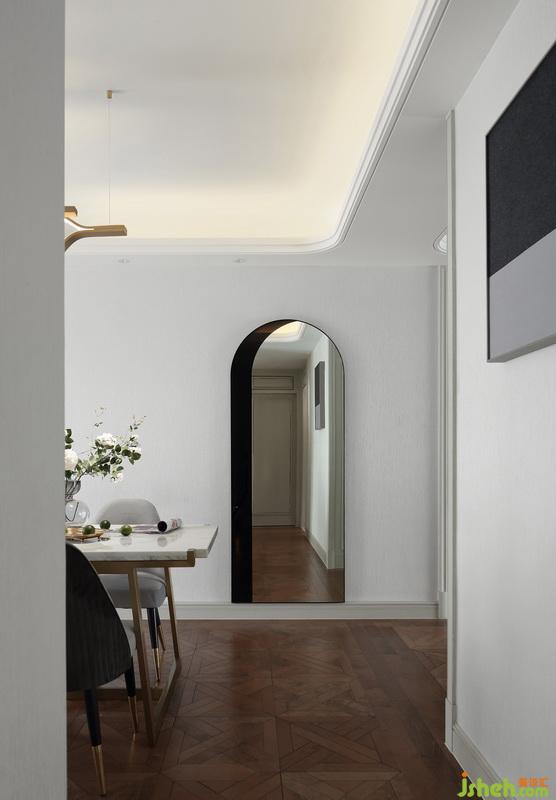 餐廳旁的拱形裝飾鏡造型別致,給過道增添了一份樂趣,黑色加銀鏡的組合,又散發(fā)出一種神秘的氣質(zhì)。