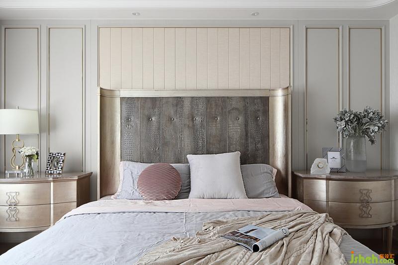 主臥的大床在色調(diào)上與背景墻相協(xié)調(diào),耳翼造型的床頭給人包圍感,整體很溫馨又顯示出獨(dú)特的時髦感。對稱的床頭柜色調(diào)迷人,流線型設(shè)計加上里拉琴金屬拉手,既美觀又實(shí)用。晶石制作的座鐘簡約唯美,提升了家居的格調(diào),更像是一份藝術(shù)收藏品。床頭柜上放置了銀葉菊花束,寓意“收獲”,一團(tuán)團(tuán)的像是飄散在地上的雪花一樣,成為家中視覺上的一大亮點(diǎn)。