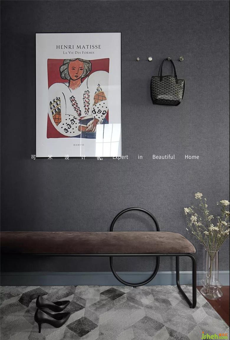 打開門進(jìn)入玄關(guān),一副復(fù)古掛畫映入眼簾,就像是游動在墻上的藝術(shù),看到它使我們疲倦的內(nèi)心一下放松了許多,又恰到好處的遮住了配電箱,營造出最美好的玄關(guān)一角。兩大兩小的掛鉤簡約而精致,方便我們的同時(shí)也輕松地裝飾了墻面。換鞋凳造型時(shí)尚,顏色與整體色調(diào)相匹配。地上放了一塊黑白灰組合的多邊形地墊,顯得時(shí)尚又高級。裝修公司