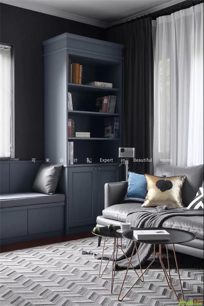 沙發(fā)另一側(cè)定制了與對面同色的書柜,上面可以放些愛看的書,下面作為收納。地上還放了一個(gè)落地式的小音箱,閑暇時(shí)靠在沙發(fā)上聽聽音樂,看看書,也是非常愜意的事。