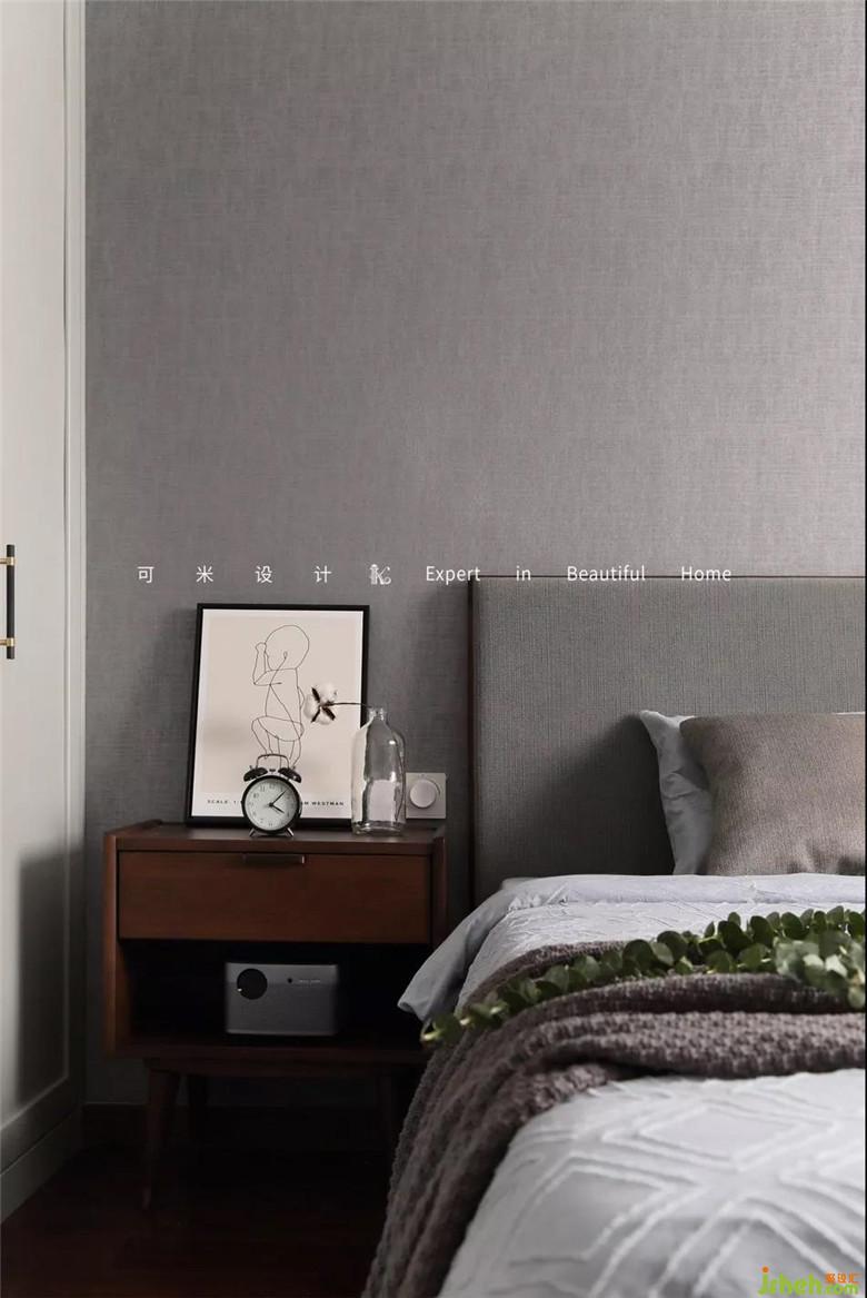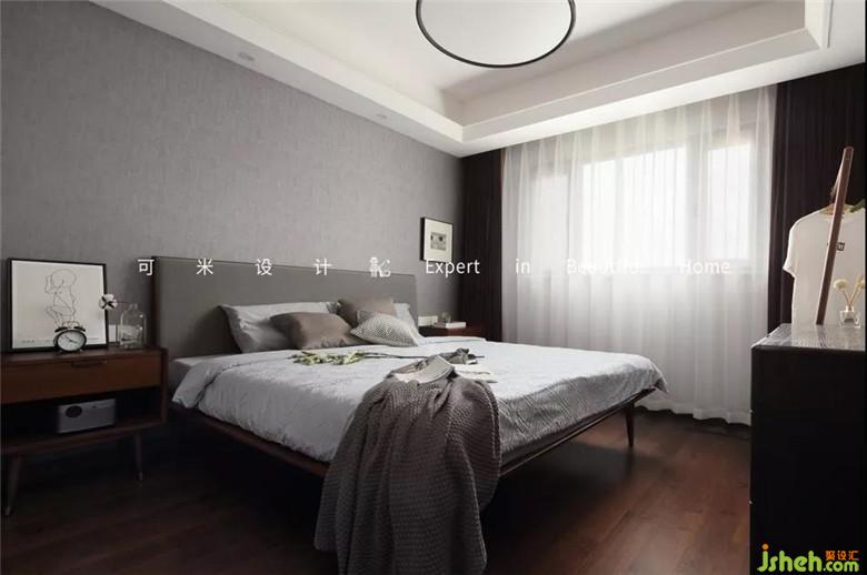 主臥的墻面貼滿了灰色的墻布,搭配的大床靠背也是灰色的,與客餐廳的整體色調(diào)保持一致。當(dāng)陽光透過窗戶照射進(jìn)臥室,可以打破屋內(nèi)的暗色,產(chǎn)生一種明快的視覺感。