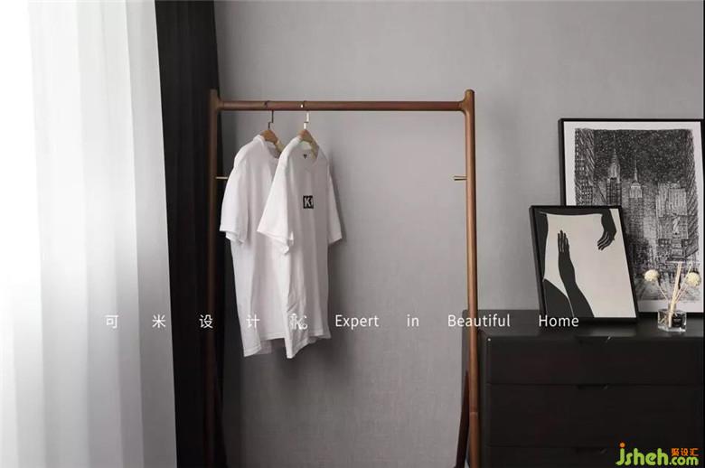 主臥一角放置了一個黑胡桃色的掛衣架,讓每一件衣服歸來后,都優(yōu)雅從容,感受簡單的美好。