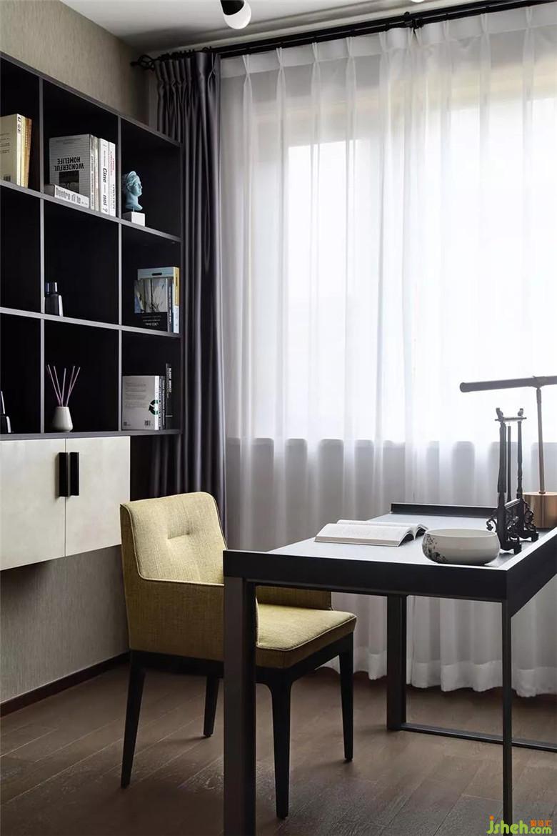 光線明亮的書房,配上木質(zhì)的家具、地板,以及橄欖綠的椅子,營造出相對溫潤的氛圍;至于墻上的書柜則是定制款,是依據(jù)整屋色系而加以設(shè)計(jì)。