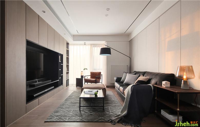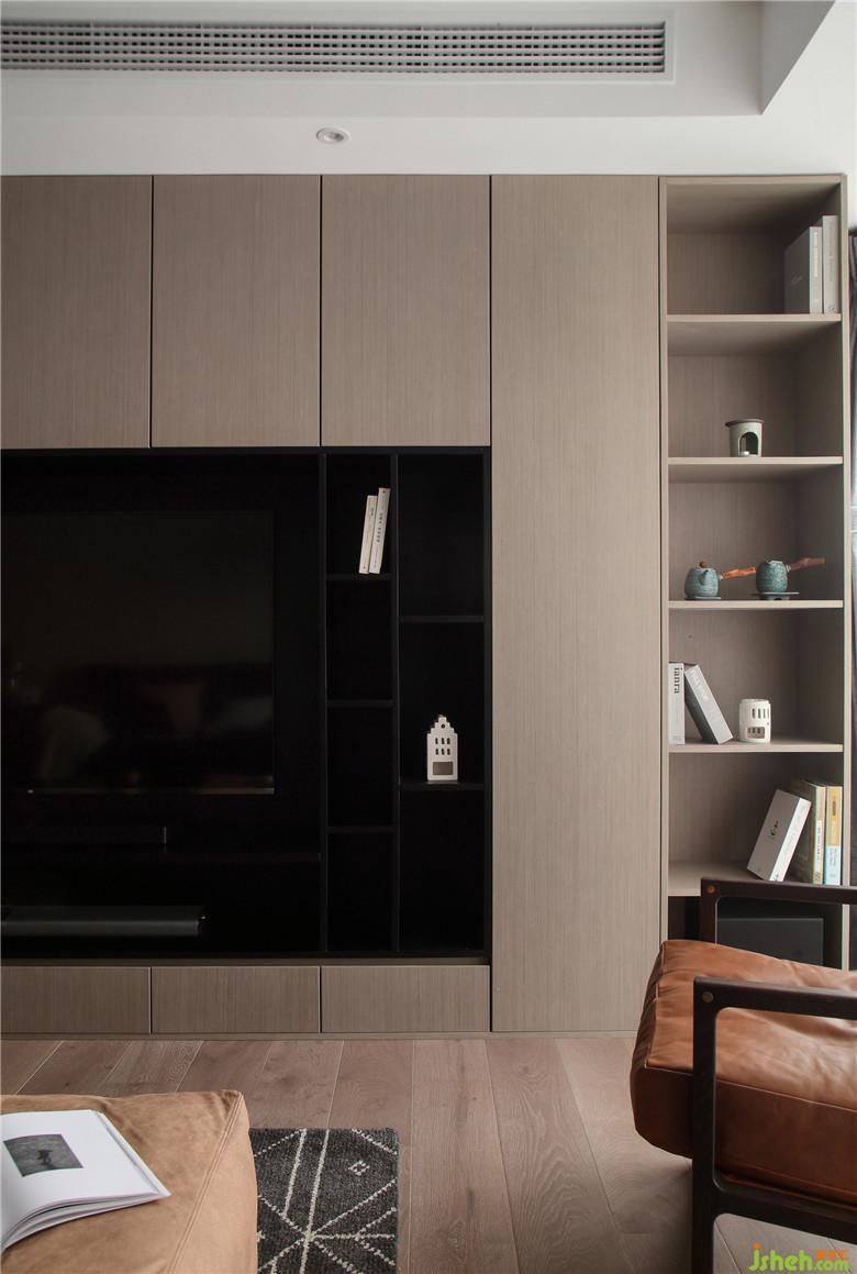 咖灰色與黑色交替的電視機(jī)背景墻,將開放式與封閉式收納相融合,既能保證足夠的收納空間,又使得整體美觀大方。