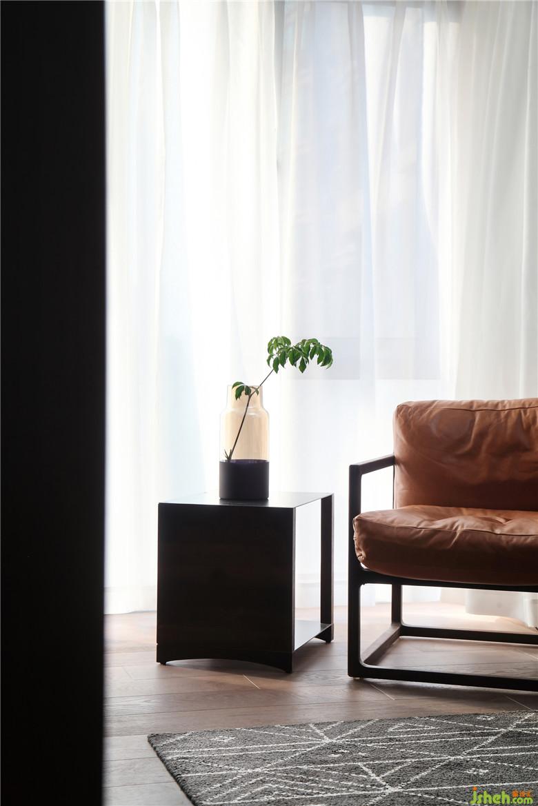 客廳一角搭配了一款單人扶手椅,實(shí)木與真皮的組合,既現(xiàn)代簡(jiǎn)潔,又自然質(zhì)樸。此處的窗戶雖然是朝西,但是窗外并沒(méi)有遮擋,午后的陽(yáng)光還是不錯(cuò)的,這個(gè)時(shí)間靠在椅子上小憩一下也是很愜意的。
