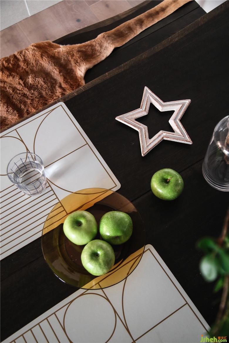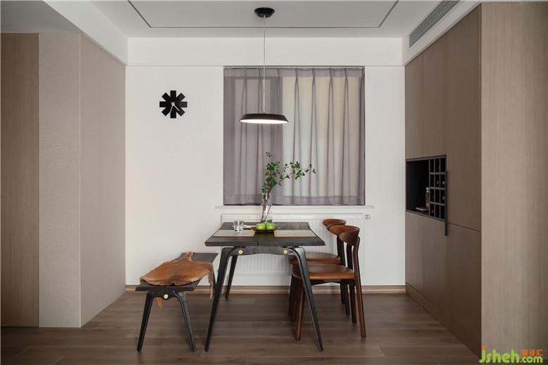 餐廳一側(cè)定制的咖灰色柜子,冰箱嵌入其中,空間上更加規(guī)整;中間做黑色鏤空,用來(lái)放置紅酒和一些裝飾物。裝修公司在對(duì)面的墻體做了淺咖灰色的護(hù)墻,一深一淺相呼應(yīng)。餐桌、椅子與條凳的組合,簡(jiǎn)約中散發(fā)一絲復(fù)古韻味,在條凳上鋪上一塊皮毛墊,恰巧為空間注入一份溫情。黑色的風(fēng)車掛鐘,充滿時(shí)尚與創(chuàng)意,起到了點(diǎn)綴作用。