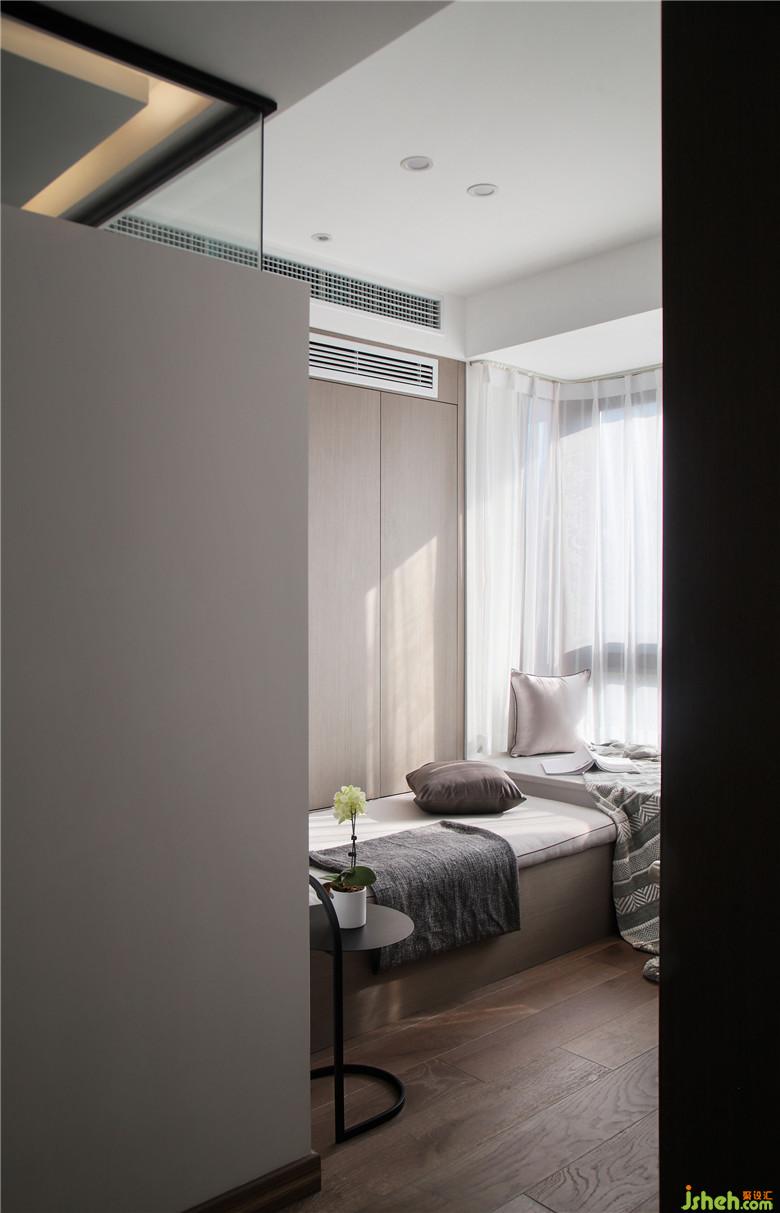從書房沿著過道可以看到客廳,此處沒有設(shè)置門,這樣可以擺脫門的限制,增加屋內(nèi)的通透性。書房與衛(wèi)生間隔墻做了40公分高的玻璃隔斷,很好的將光線引入了衛(wèi)生間內(nèi),使得屋內(nèi)的每一個房間都明亮通透。