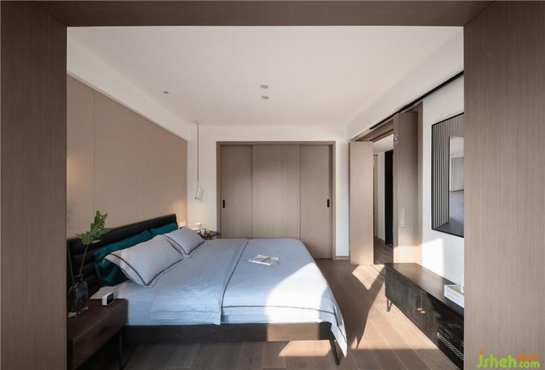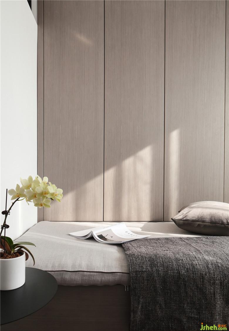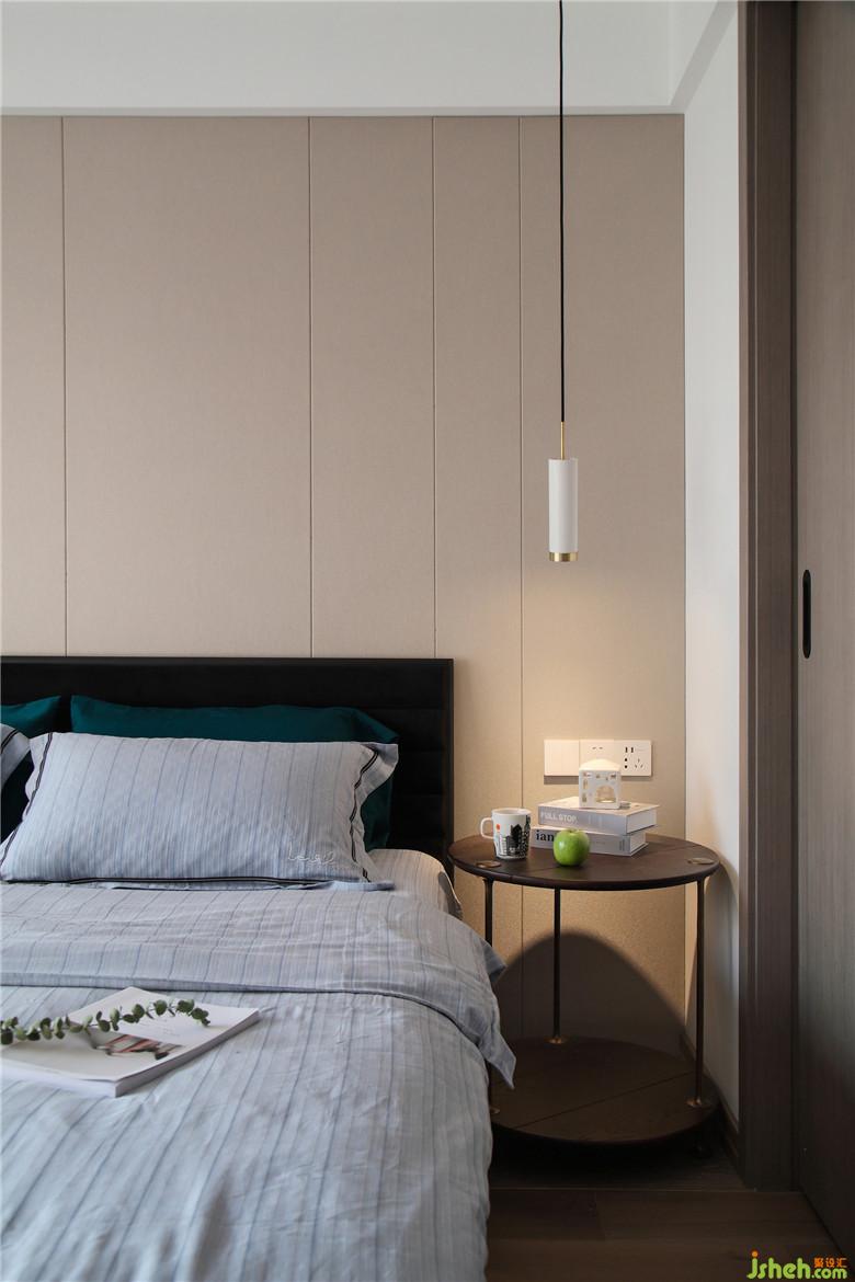 臥室的床頭背景采用了淺咖灰色的硬包,簡潔柔和,與整屋色調(diào)相一致。床頭靠背配有黑色軟包,倚靠更加舒適,搭上淺藍(lán)色的純棉床品,時(shí)尚且優(yōu)雅,給屋主帶來舒暢的睡眠體驗(yàn)。