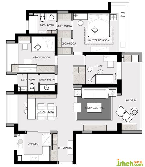 5.書房的門向內(nèi)移了1.1米,使得主臥的進(jìn)門可以向右平移,從而在主臥設(shè)置兩個衣帽間,增加了主臥的收納空間