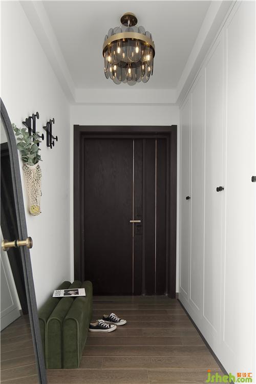 玄關(guān)處選購了一款煙灰色玻璃片與金色鐵藝組合而成的吊燈,朦朧而精致。橄欖綠的換鞋凳高貴典雅,在復(fù)古中透露出時尚氣息。墻壁上安裝了一款幾何形的掛鉤,可做進(jìn)門的簡單收納,也可作為一件精美的墻飾。旁邊搭配了一款深灰色的拱形穿衣鏡,帶有一個可掛衣的把手,既實用又充滿顏值。另一面墻定制了美觀與實用兼具的白色玄關(guān)柜,到頂?shù)脑O(shè)計,可以最大限度的增加儲物空間。裝修設(shè)計