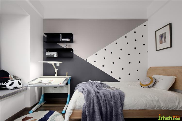 兒童床選購了一款圓角床頭的實(shí)木床,保證環(huán)保性的同時(shí)也可防止孩子的磕碰。墻上的壁紙由深灰、淺灰和白色搭配而成,不規(guī)則的圓點(diǎn)帶來一份趣味,使得屋內(nèi)充滿溫馨感。壁紙上安裝了兩塊黑色置物架,自然簡約,雅致個(gè)性,可以放些小的裝飾品,做些簡單的收納,增加了空間的利用率。