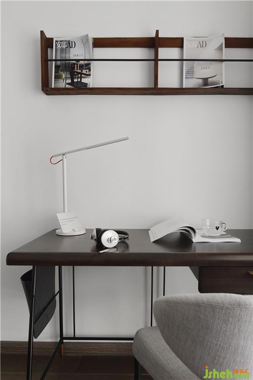 黃楊木的書桌,整體精悍利落,兼具實(shí)用與美觀。墻上安裝了一款老柚木的壁掛書架,可以作為書籍簡單的收納,拿取也方便,整體散發(fā)出復(fù)古韻味。