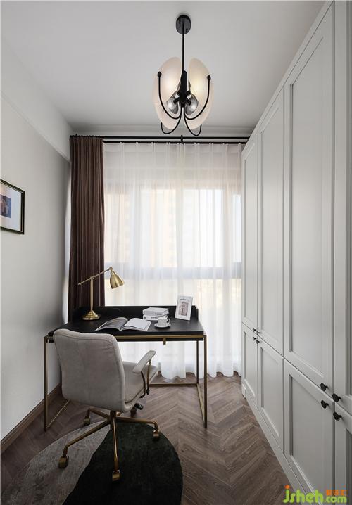 書房的一面墻定制了一排白色的柜子,與整屋色調(diào)統(tǒng)一,大大增加了屋內(nèi)的收納空間。書桌融合了實(shí)木與金屬元素,簡(jiǎn)約大方;搭配的辦公椅功能齊全,躺靠舒適,優(yōu)雅大氣。地上搭配的圓形地墊,為空間帶來一絲暖意。