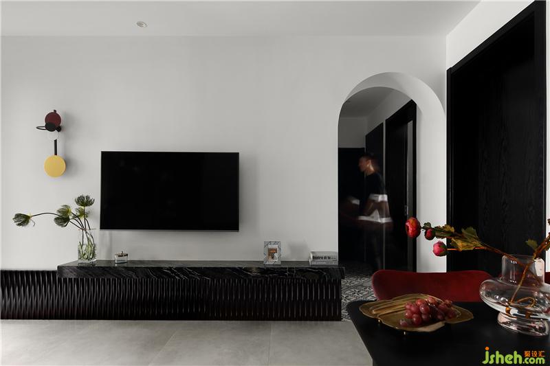 電視背景墻到門廳的墻面上安裝了高度45公分的墻裙,用波浪板定制的,增加了空間的線條感與立體感,時(shí)尚美觀,提升了整屋的檔次。嵌在墻上的黑色花紋大理石,懸空設(shè)計(jì)看起來(lái)十分輕盈,這樣的電視柜簡(jiǎn)約又顯得高級(jí)感十足,提高了空間的利用率,散發(fā)出別具一格的大氣與內(nèi)斂。室內(nèi)設(shè)計(jì)師