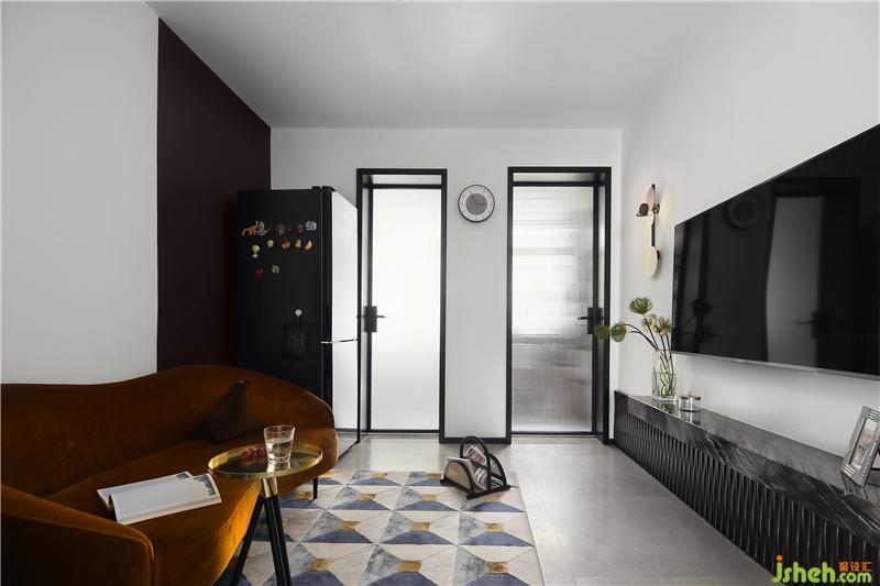 地面配上一塊多彩的幾何地毯,使得整個(gè)空間更加溫暖,充滿格調(diào)。地毯一角放上一款輕巧的藤編雜志架,收納幾本愛(ài)看的書(shū)籍,坐在此處吃點(diǎn)水果零食,也是特別愜意的。廚房和衛(wèi)生間的門都安裝了長(zhǎng)虹玻璃,自帶朦朧效果,視覺(jué)上可以起到延伸的效果,又可以優(yōu)化室內(nèi)的采光,令空間更顯通透。
