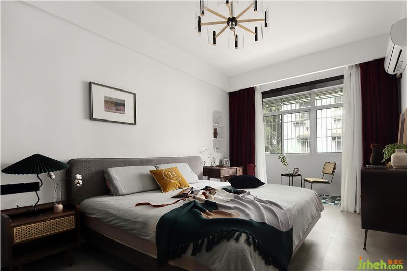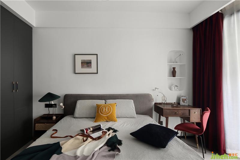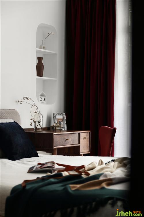床頭背景墻設(shè)計(jì)了一處壁龕,配合兩塊隔板,可形式一定的收納。壁龕洞的外沿四周,似有畫框的感覺(jué),在洞內(nèi)放置上陶制的小花瓶,襯托出一種意境之美。搭配上酒紅色的窗簾,柔和的光線打破了它的沉悶,帶來(lái)一絲雅致與清新,更顯酒紅的質(zhì)感。