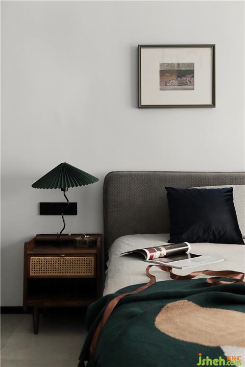 床頭柜帶有時(shí)髦又經(jīng)典的復(fù)古調(diào)調(diào),藤面編織的柜面更加耐看,顏值與實(shí)用兼具。傘狀的臺(tái)燈,線條靈動(dòng),充滿設(shè)計(jì)感,墨綠色又給臥室?guī)?lái)了一份溫情與羞澀。