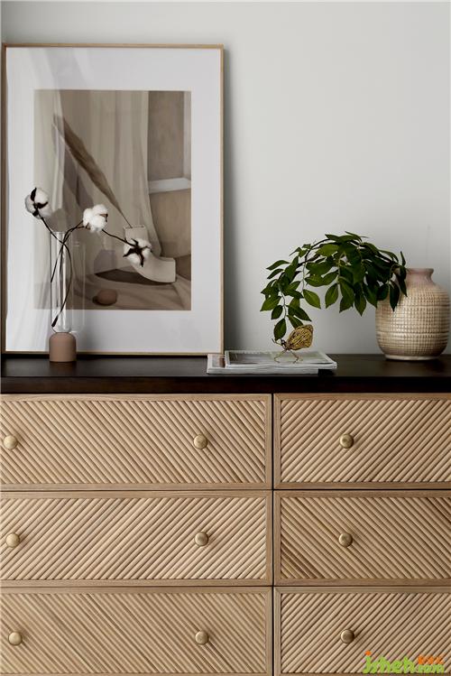 主臥一角購(gòu)置了一件摩卡色的六斗柜,自然美觀,安靜而溫馨;擺放上一幅裝飾畫,再配以插花和綠植,就成為了臥室里的美麗一角了。
