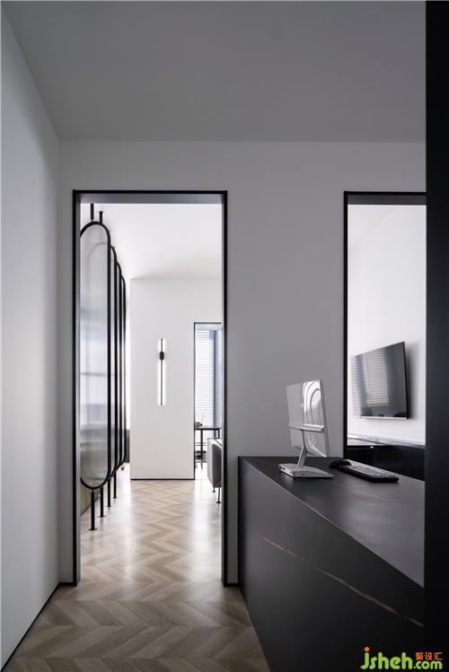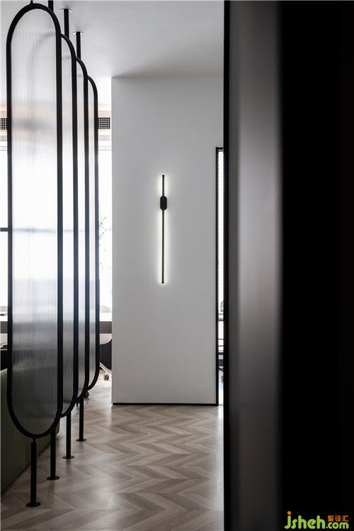 進(jìn)入室內(nèi)是一條1.1米寬的過(guò)道,埡口做了黑色的包邊,黑白之間更顯精致感。盡頭處的黑色壁燈,看似簡(jiǎn)單的幾何圖形,卻富有美感,讓簡(jiǎn)約的空間更具現(xiàn)代感。