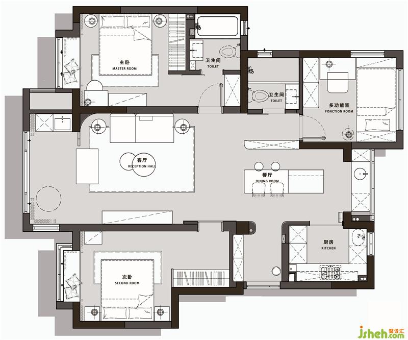 2. 衛(wèi)生間保留兩個(gè),其中主衛(wèi)需要浴缸
