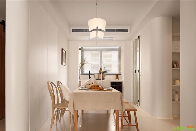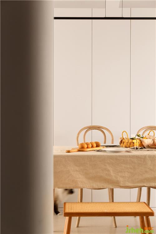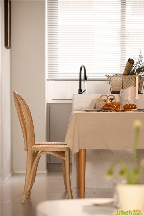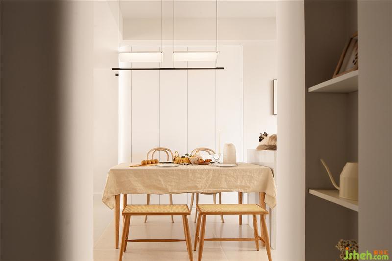 通過玄關(guān)就來到了餐廳,餐廳采用餐桌+兩把靠椅+兩把條凳的組合方式,使空間看起來不死板,沒有靠背的條凳也會(huì)更節(jié)省空間。餐桌椅選擇了原木材質(zhì),搭配上藤編的工藝,南京室內(nèi)設(shè)計(jì)師自帶一種質(zhì)樸隨和的氣質(zhì),在光線的暈染下,整體散發(fā)出復(fù)古韻味。餐桌鋪上一塊奶咖色的餐布,營(yíng)造出溫暖、有活力的氛圍,更能增加食欲。餐椅后面的墻體拆除后,定制了一排暖白色的儲(chǔ)物柜,轉(zhuǎn)角處同樣采用了圓弧處理,增加收納的同時(shí)又使空間顯得更輕盈明潤(rùn)。
